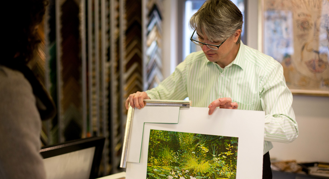 Wir nehmen uns Zeit für Sie. Sowohl bei der Auswahl neuer Kunstwerke als auch bei der Rahmung ihrer eigenen Bilder und Objekte. Fachkundige Beratung, die Auswahl aus über 600 Musterleisten aktueller Kollektionen namhafter Hersteller, variantenreiche Passepartouts und ein ideenreiches, motiviertes Team in der Werkstatt geben Ihren Schätzen den Rahmen, den sie brauchen.
