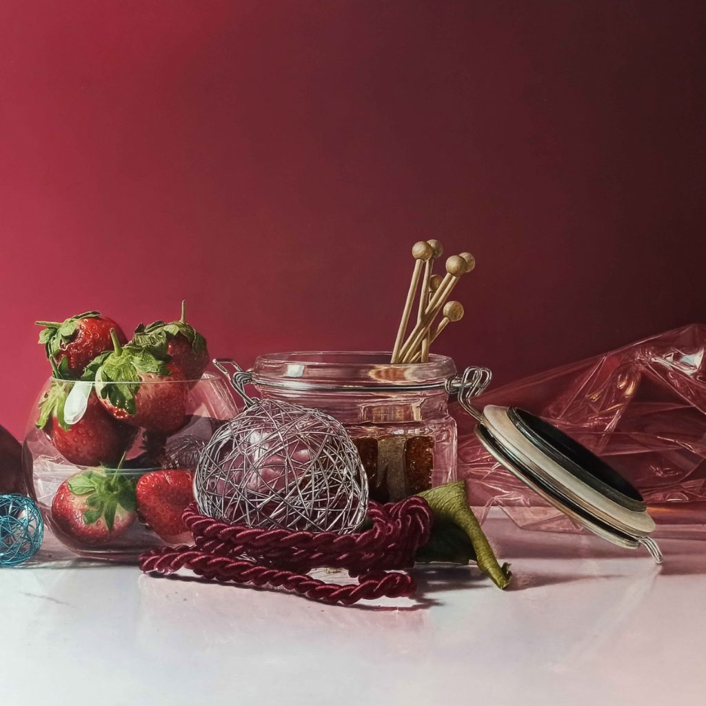 Inspiriert von Meistern des Manierismus und gut gerüstet mit einer grundsoliden Ausbildung der renommierten Leipziger Schule beschäftigt sich Florian Tschernitschek mit dem „Objekt im Raum“. Unter weitgehendem Verzicht auf Staffage schafft er räumliche Tiefe allein durch die Körperhaftigkeit seiner dargestellten Objekte und Figuren. Dabei bedient er sich der klassisch orientierten Schichtenmalerei. In strikter Farb- und Formtrennung wird das Bild in den Grundzügen angelegt und die Formen nach udn nach in vielen Lasurschichten mit Ölen und Harzen abschattiert.