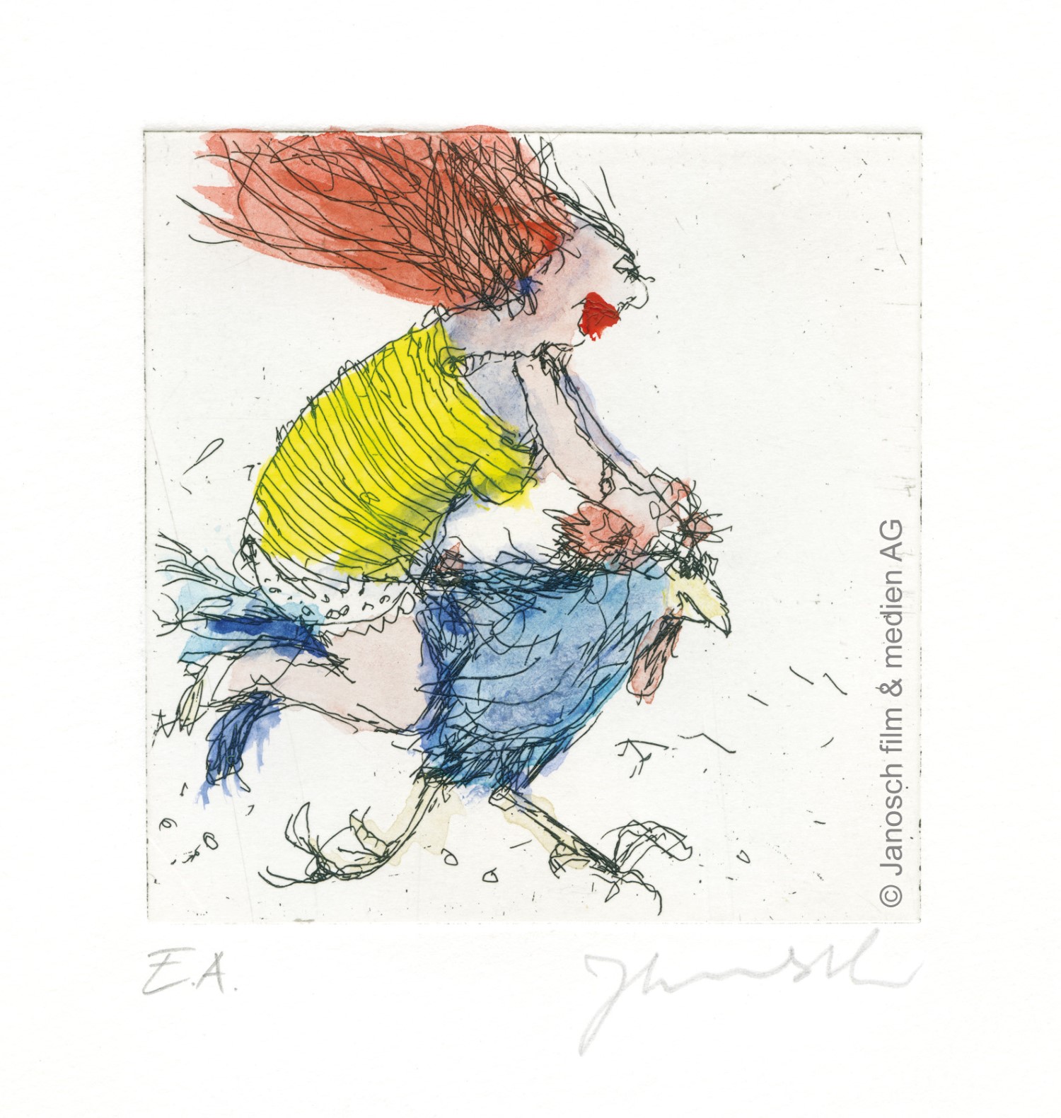 DER HAHN IST MEIN MANN UND ICH HEISSE LUISE . Radierung . Bildformat: 10×10 cm . Blatt: 35×35 cm