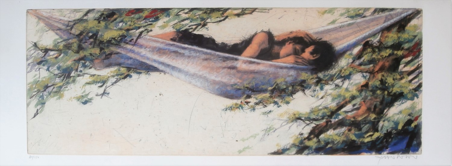 HÄNGEMATTE IM LAUB . Radierung . Bildgröße: 33×89 cm . Blatt: 38×103 cm