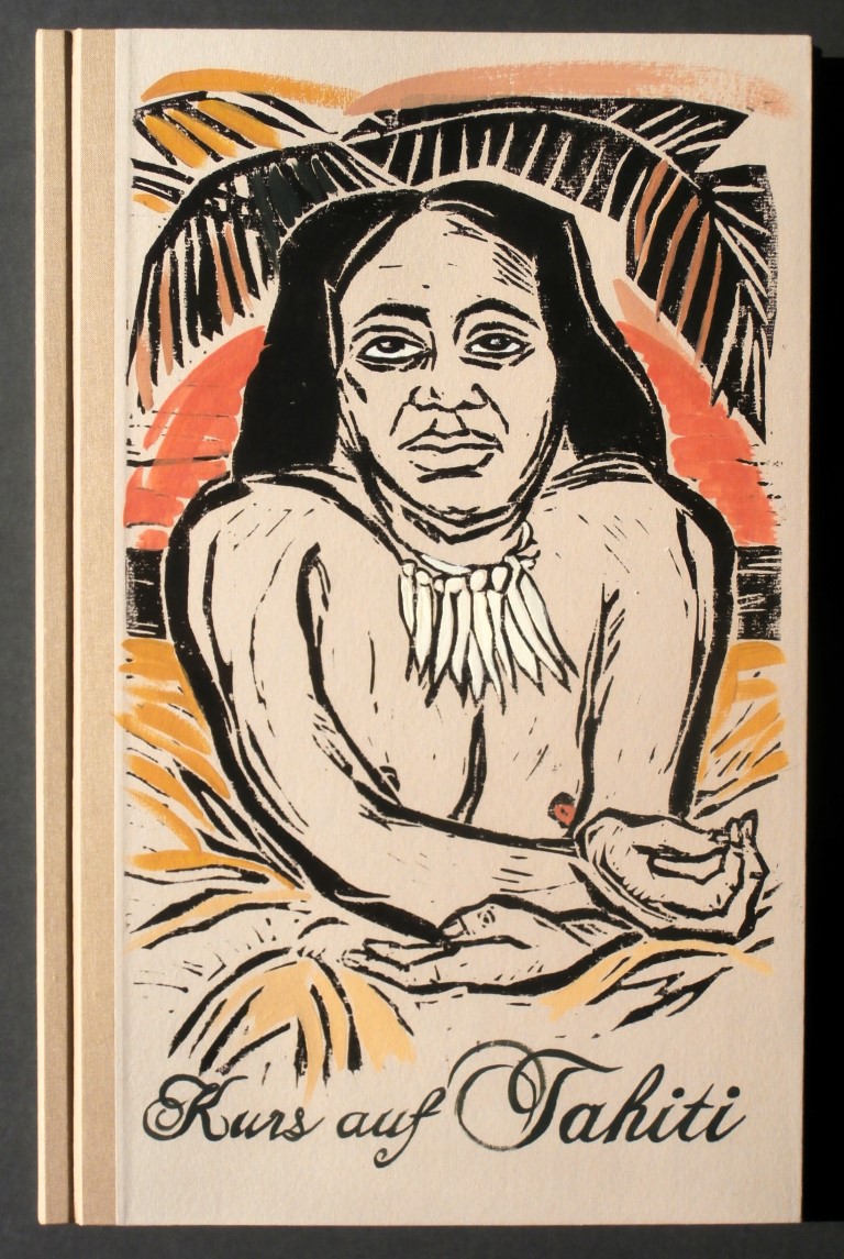 / KURS AUF TAHITI . Buch Cover . Auszüge aus den Tagebüchern von James Cook 1768 – 1779 . handgedruckte Farblinolschnitte auf Ingrespapier, Text auf Pergament . Auflage 10 Exemplare . 50 x 32 cm