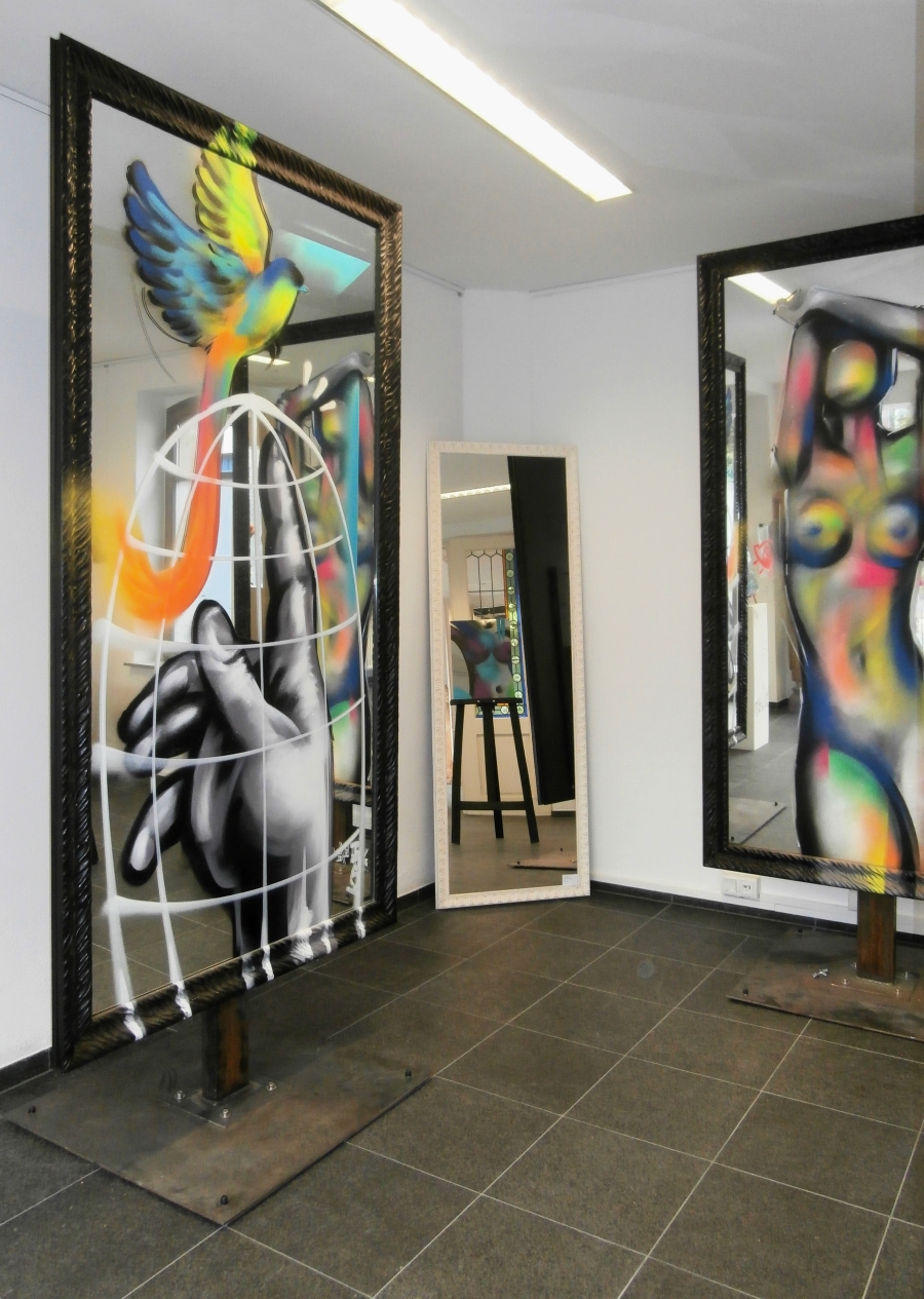 / MRCY . Spiegelkunstwerke . Spray auf drehbaren Spiegeln . 218x120cm