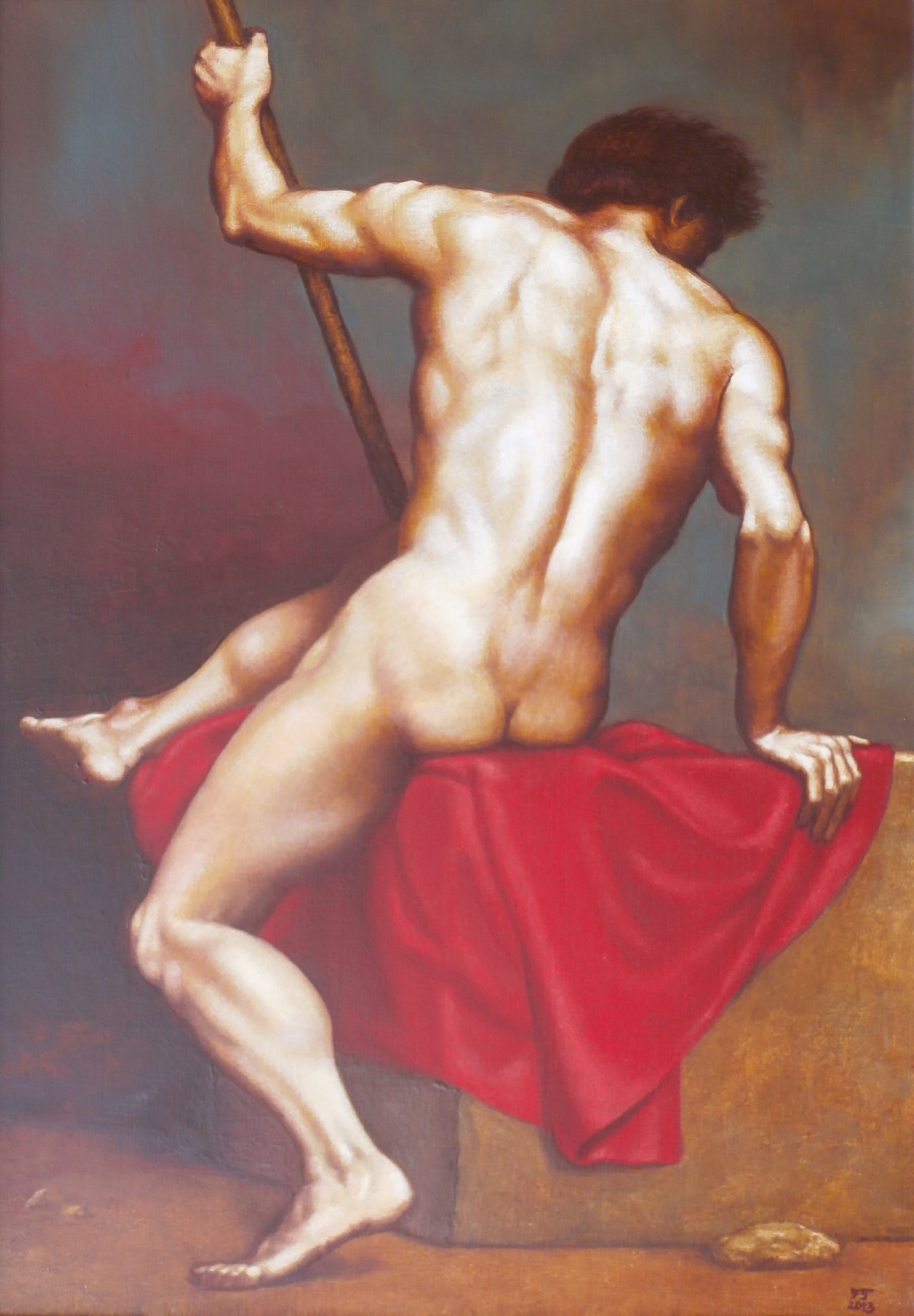 RÜCKENAKT MIT ROTEM TUCH . 2013 . Mischtechnik auf Malplatte . 56,5×40 cm