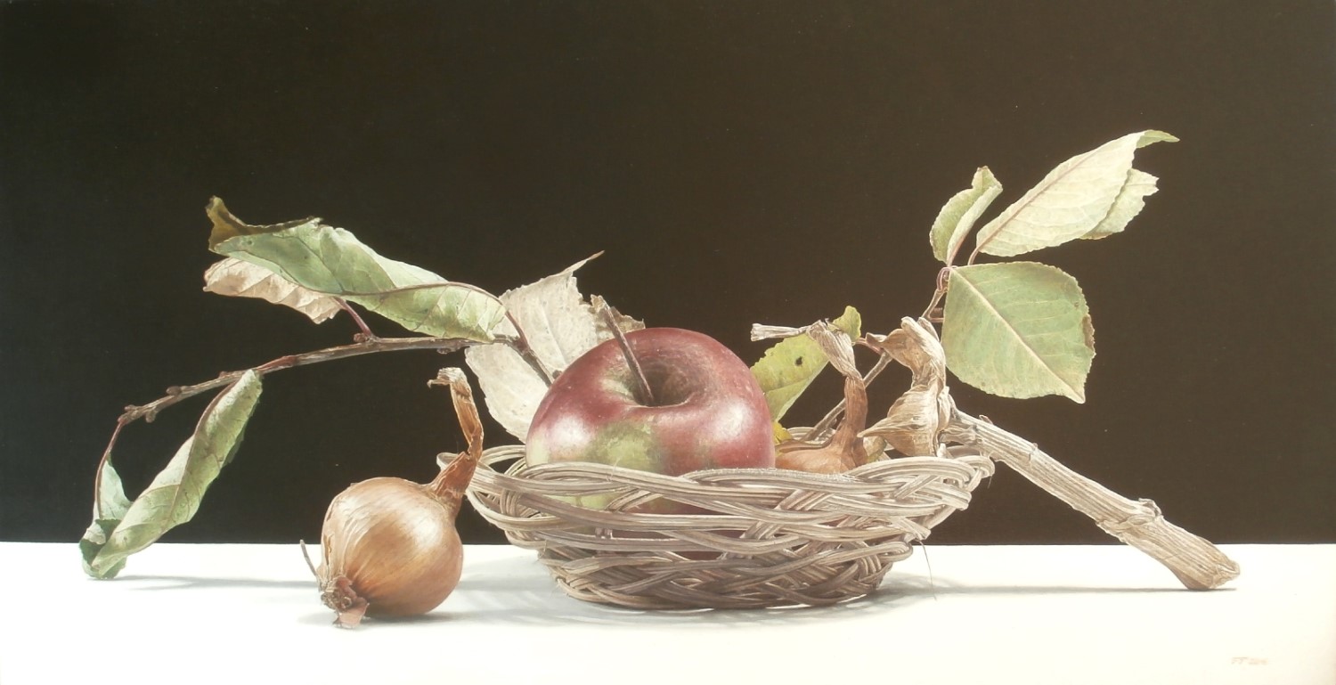 STILLEBEN – APFEL MIT ZWIEBELN IM KORB . 2018 . Mischtechnik auf Malplatte . 41,5×80 cm