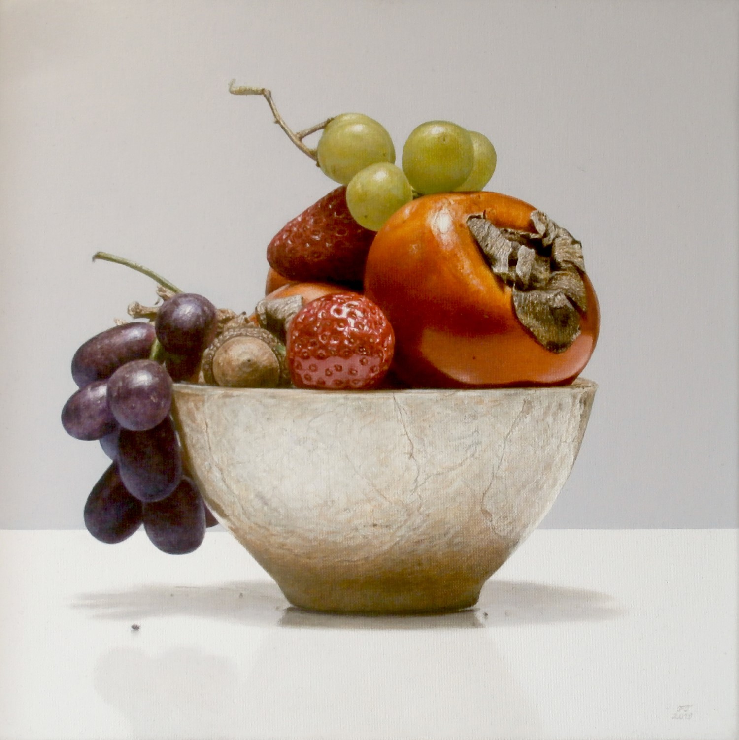 / STUDIE – STILLEBEN MIT SHARONFRUCHT . 2019 . Mischtechnik auf Leinwand . 30×30 cm