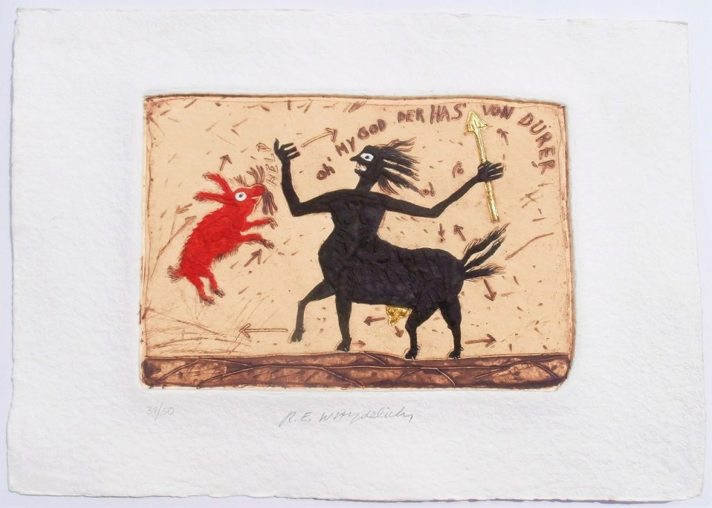 Die Lust am Entdecken, am Präsentieren und Erzählen teilt sich in der Kunst Raymond Waydelichs auf besondere Weise mit. Phantastische Geschichten entspinnen sich beim Betrachten seiner Bilder. Sie sind bevölkert von der exotischen Tierwelt Afrikas, die der der viel Gereiste erlebte – oder mythologischen Gestalten der Antike, die Ausgrabungsstätten entsprungen scheinen, die er besuchte. In ihrer schattenhaften Darstellungsweise erinnern sie an prähistorische Höhlenmalereien, in Kombination mit Spruchbändern an griechisch-archaische Vasenmalereien. Dazu kommt eine fast kindliche Freude an beweglichen Teilen. In seinen Graphiken, die keine kinetischen Kunstwerke sein können, übernehmen Pfeile die Visualisierung von Bewegungsmustern. Herzerfrischende Naivität und Raffinement des reifen Künstlers, dazu ein kräftiger Schuss elsässischer Humor machen Raymonds Bilder zu einen visuellen Vergnügen.