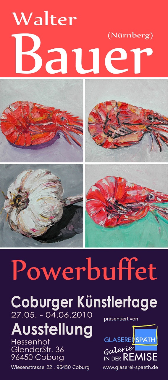 Mit Bezug auf die Bayerischen Theatertage hat Gastgeber Sebastian Heß ein Coburger Künstlerfest ins Leben gerufen. Mit einem POWERBUFFETT in Öl haben wir Gamälde von unserem beliebtesten Künstler Walter Bauer beigesteuert. Zu sehen waren saftige Früchte, schicke Garnelen und frische Fische, sahnige Torten, coole Kühe…