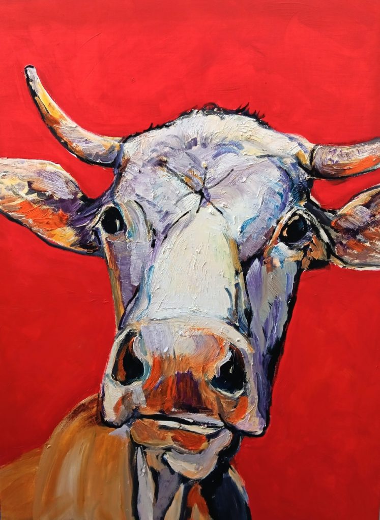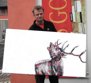 Seine Powermalerei gehört seit seiner ersten Ausstellung 2005 bei uns zum Erscheinungsbild der Galerie. Unvergessen sind seine Bilderserien mit Tortenstückla, die mit sahnig aufgetragener Ölfarbe durch das Bildformat schippern und die Sambistas, die er 2009 zum Coburger Samba-Festival für uns kreiert hat. Seine Tierportraits erfreuen sich großer Beliebtheit. In ihnen charakterisiert er – mit fränkischem Humor – Typen, die man mit großer Freude im Familien-, Freundes- und Bekanntenkreis auch immer wieder findet: Lachende Kamele, Röhrende Hirsche, Blubbernde Karpfen, rollende Möpse, brummende Hummeln…